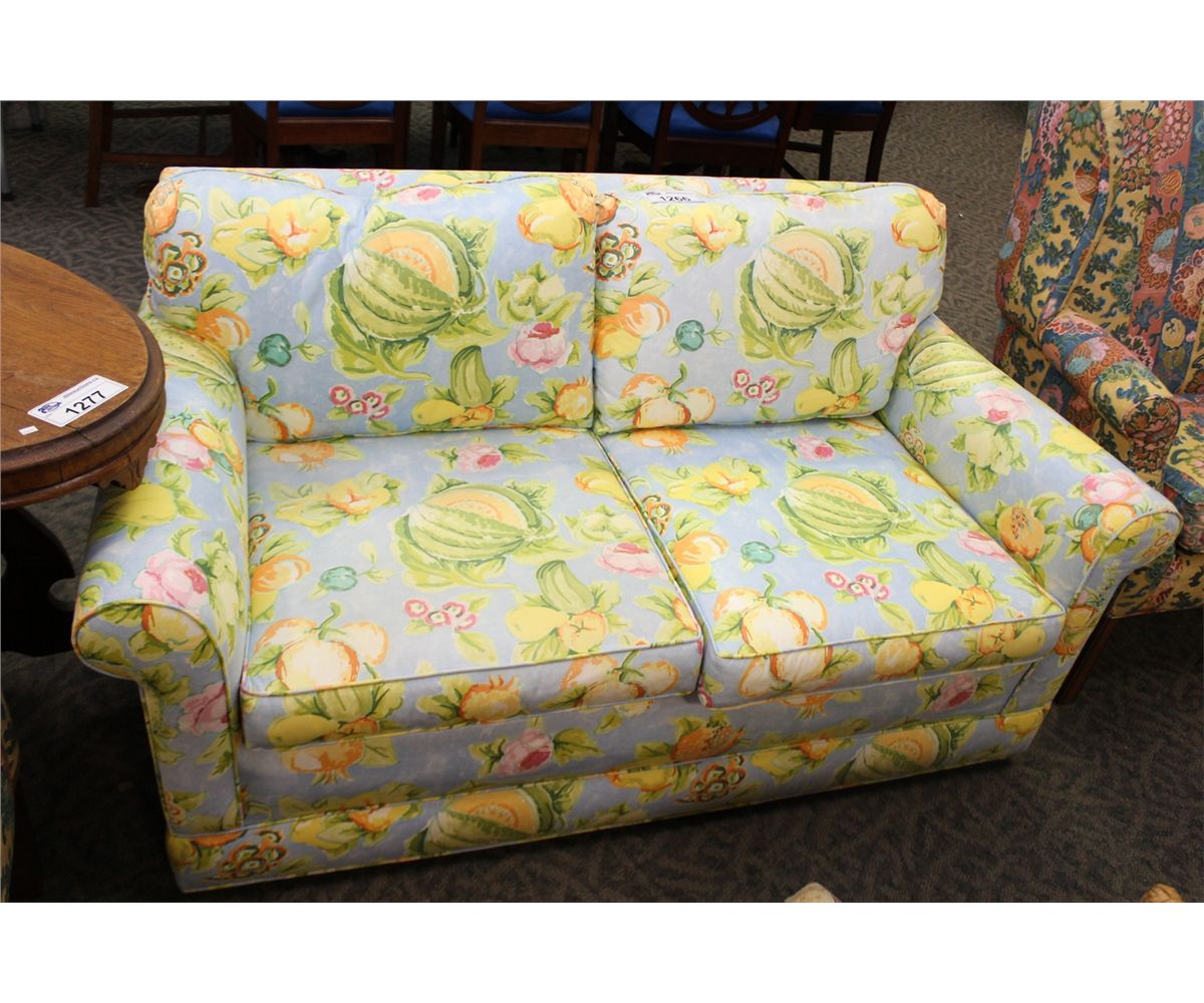 YELLOW AND BLUE CUSTOM UPHOLSTERED LOVE SEAT BY SMALL AND BOIS