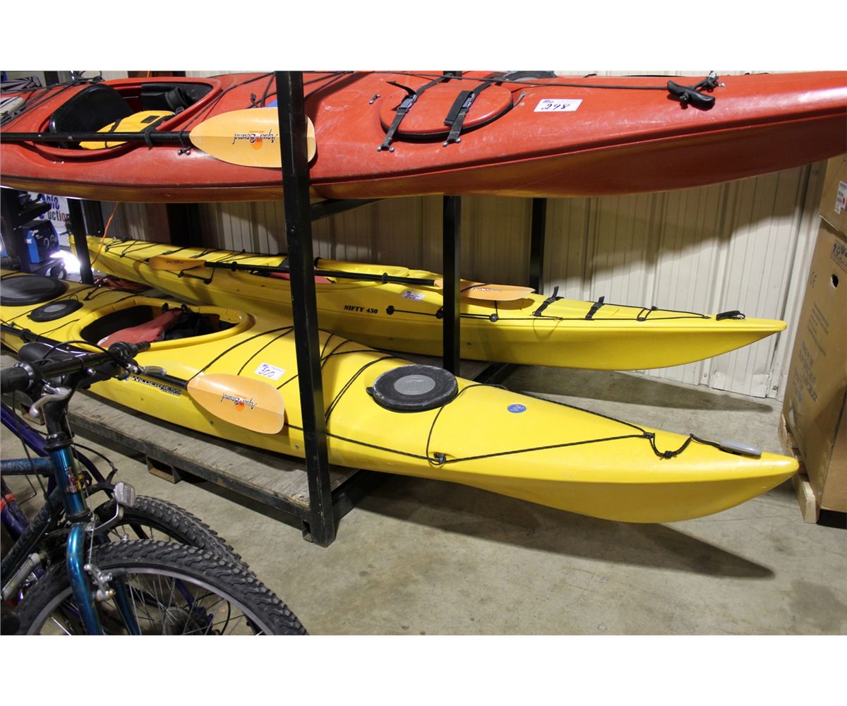 YELLOW DELSYK NIFTY 430 SINGLE PERSON KAYAK WITH AQUA BOUND PADDLE AND LIFE JACKET