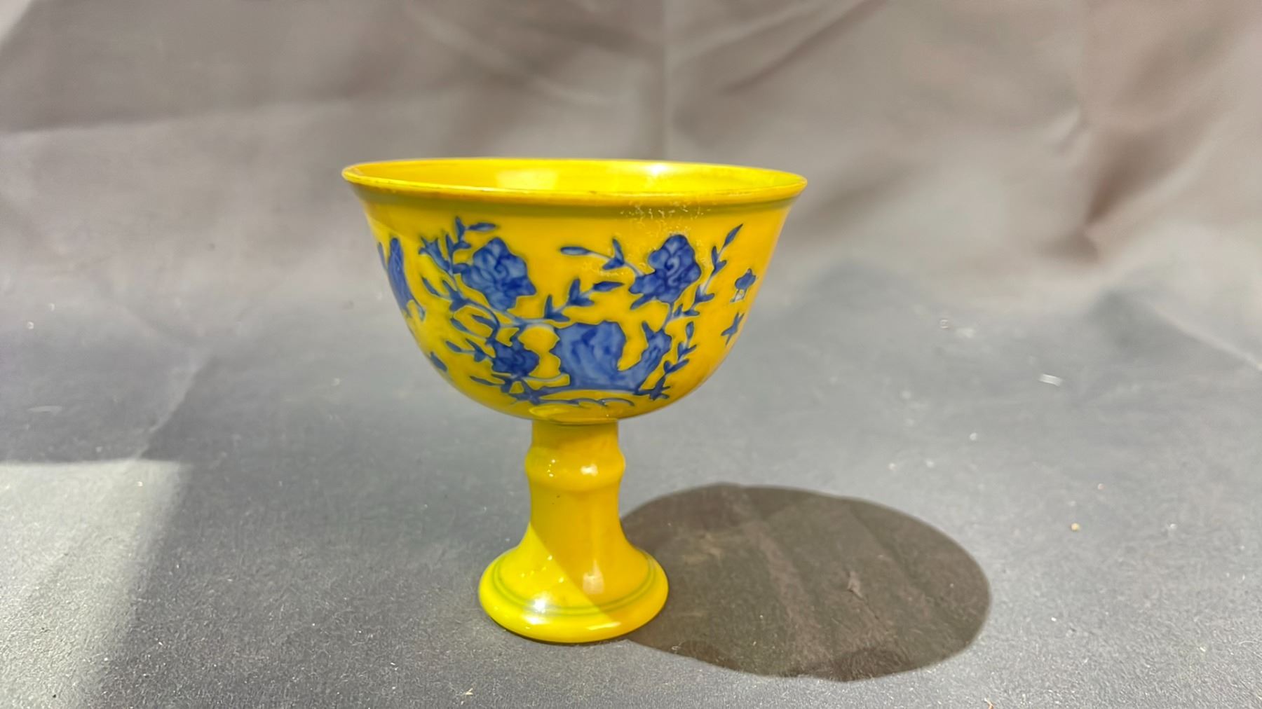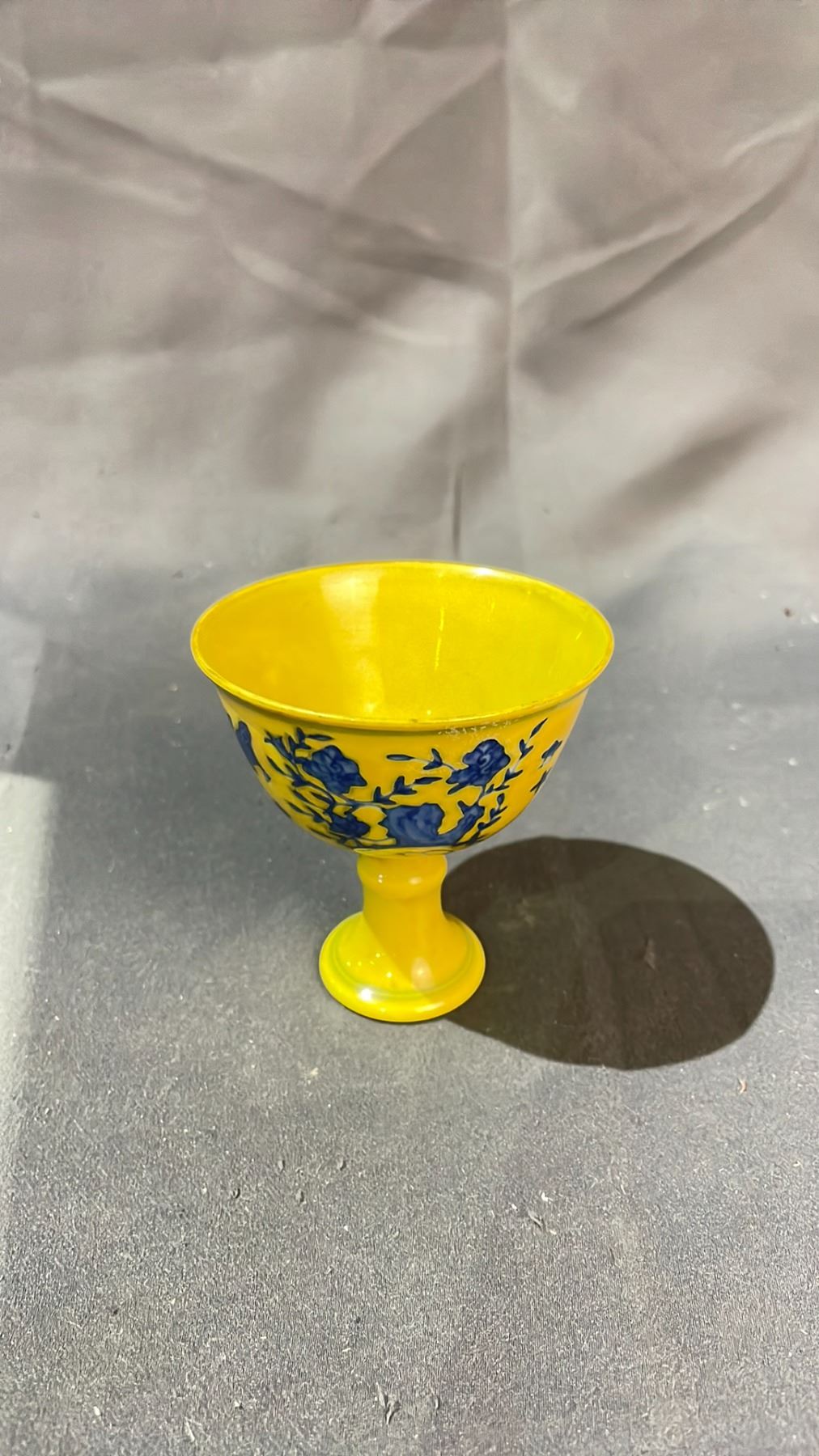 YELLOW GROUND BLUE AND WHITE STEM CUP APPROX 3" HIGH