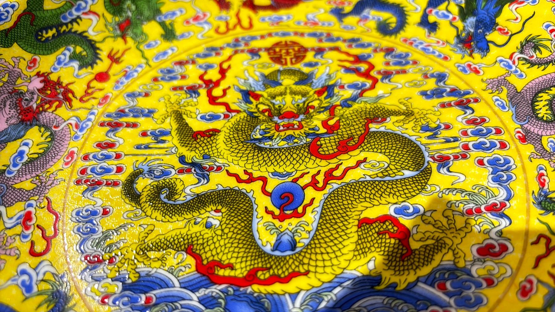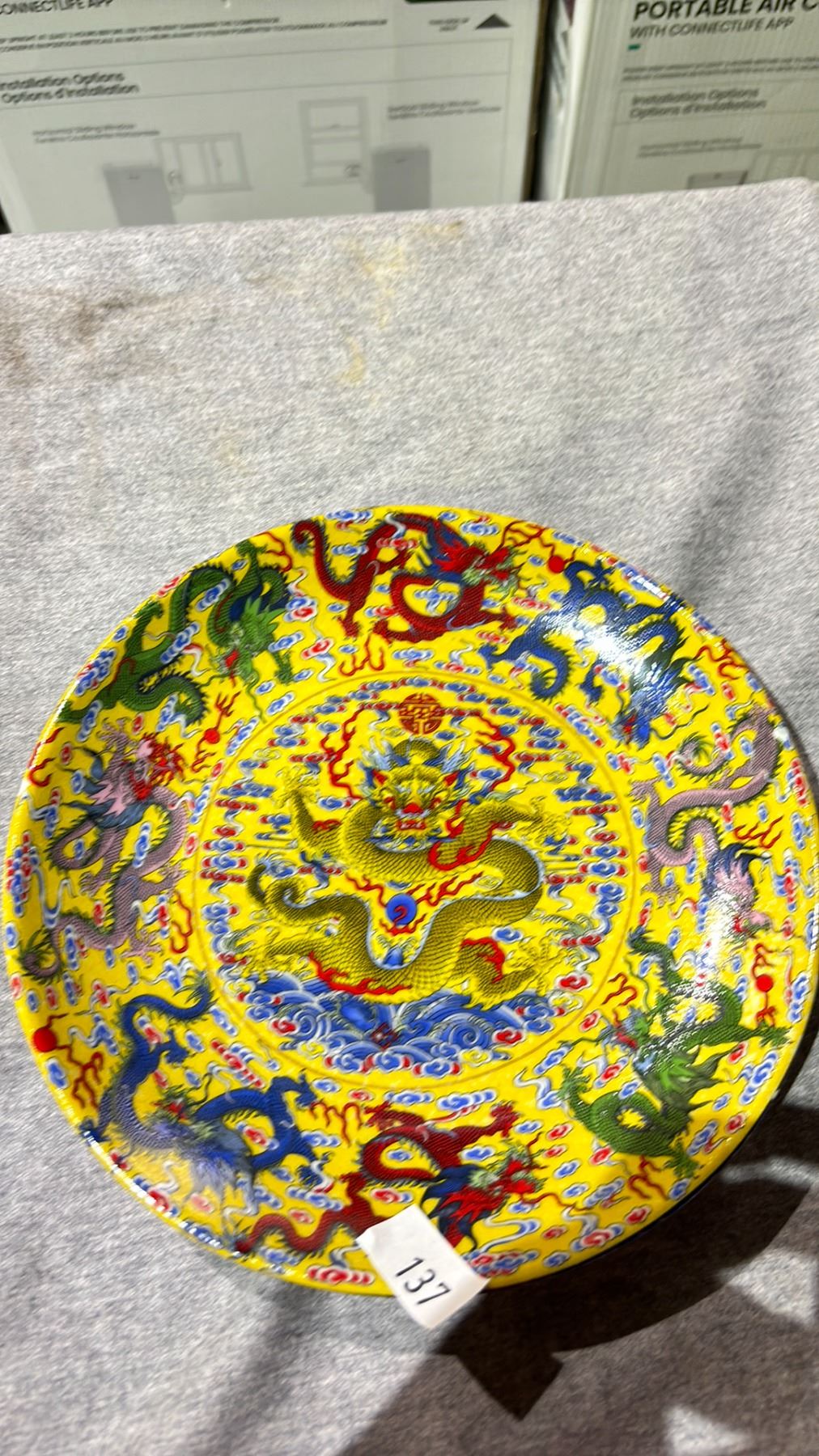 YELLOW GROUND COLOR ENAMELED DRAGON DISH