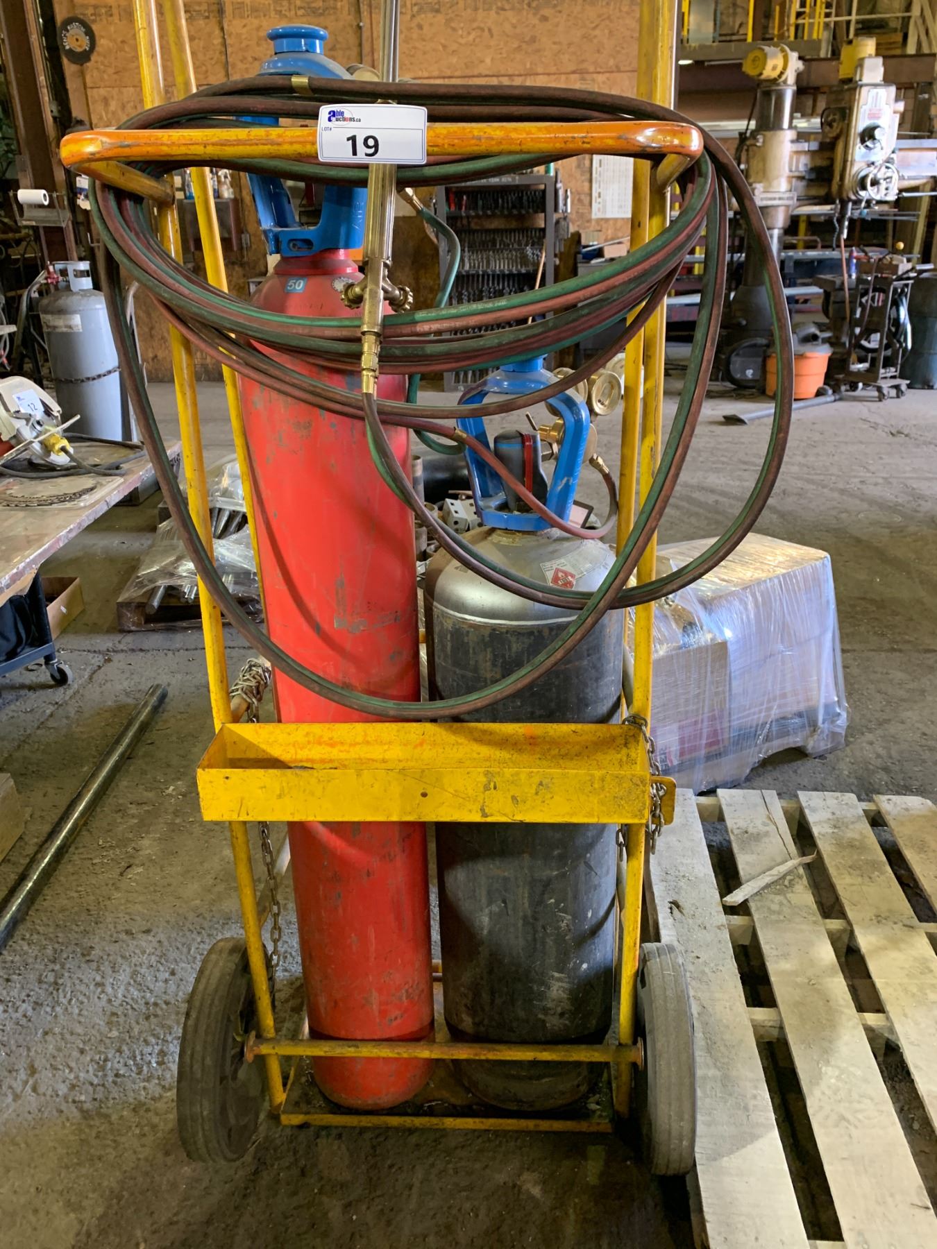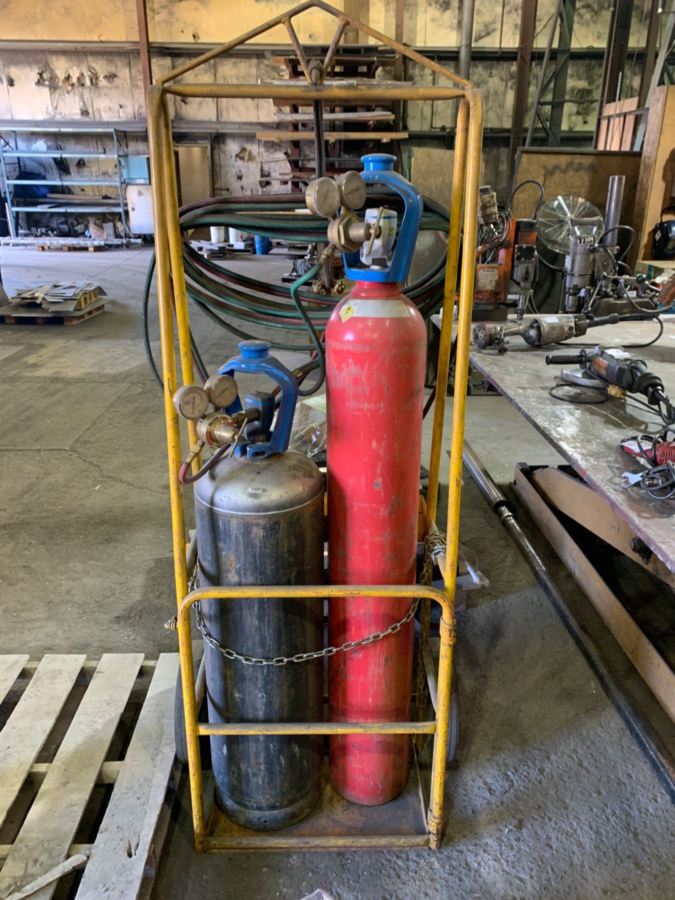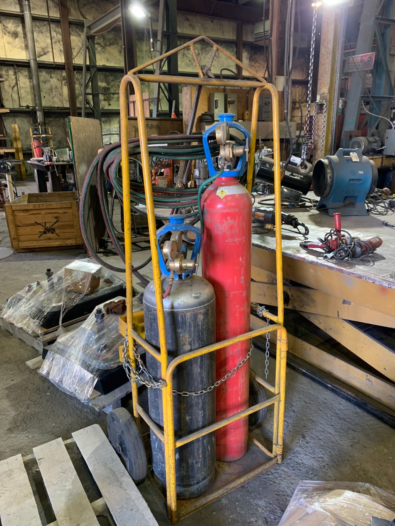 YELLOW METAL 78"H X 46"W MOBILE DUAL TORCH CART WITH HOSES, REGULATORS, TRIGGER & TORCH HEAD