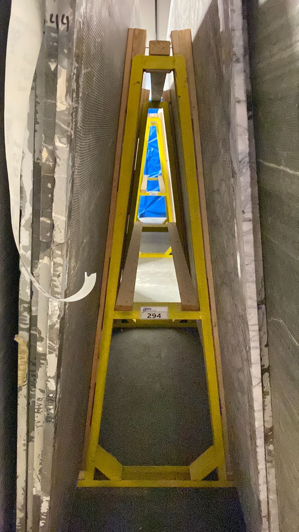 YELLOW METAL A-FRAME MATERIAL STORAGE RACK - 60" ACROSS X 60" WIDE AT BASE X 64 1/2" WIDE