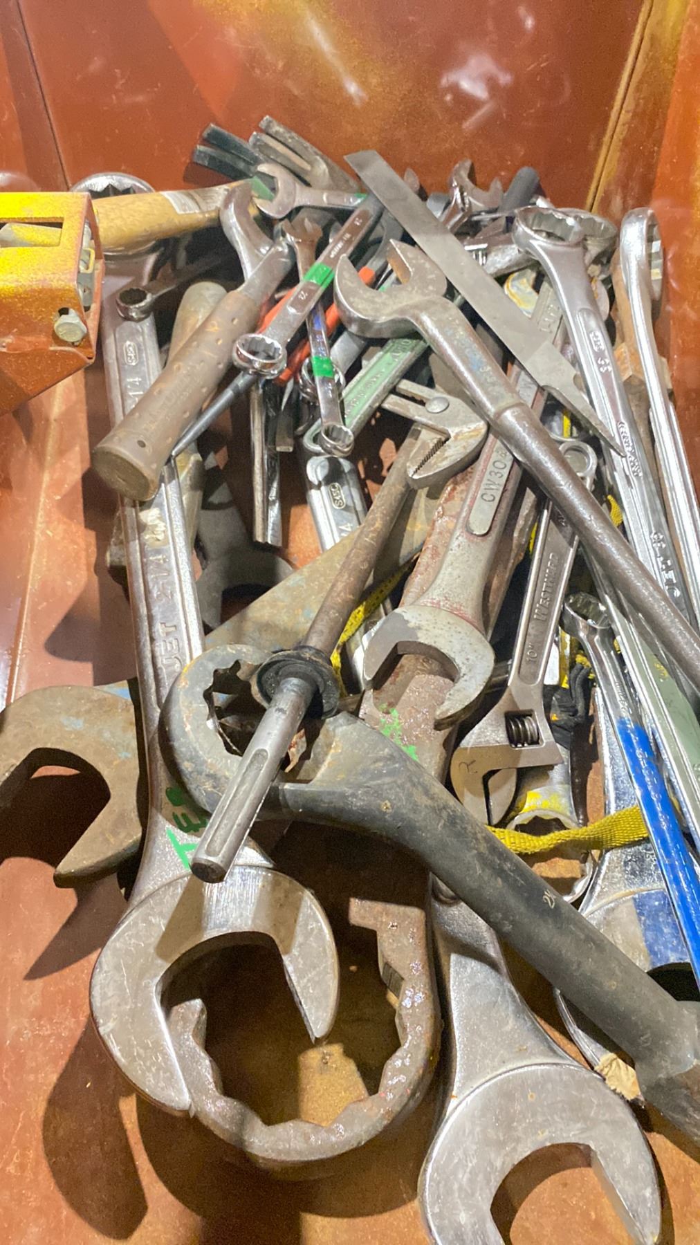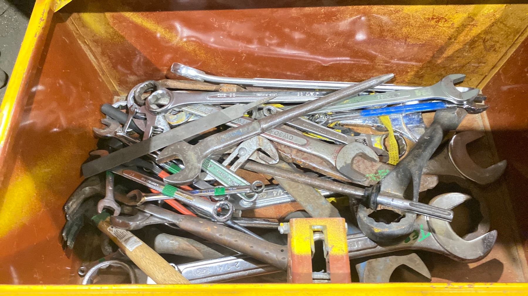 YELLOW METAL JOBSITE BOX FILLED WITH ASSORTED WRENCHES