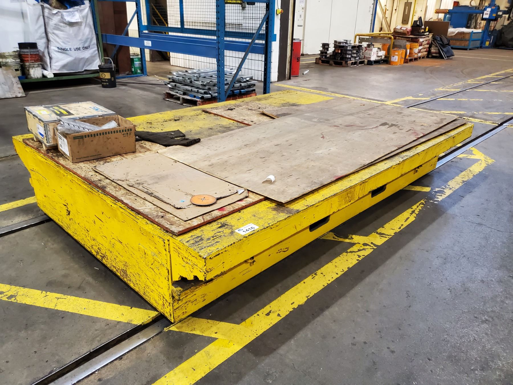 YELLOW METAL RAIL CART 120"L X 84'W X 20"H WILL REQUIRE CRANE TRUCK TO MOVE