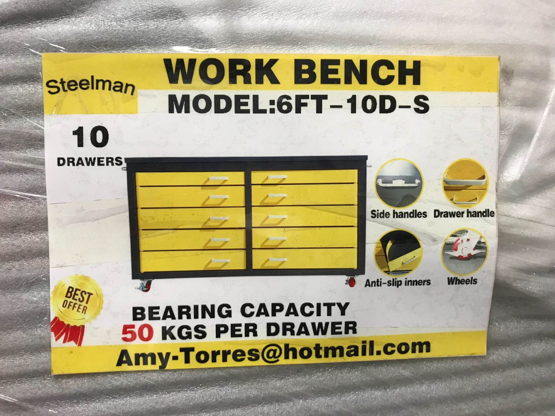 YELLOW STEELMAN 10 SWING DRAWER WORKBENCH H36" X W67" X D24" WITH ANTI-SLIP LINING LOCKING DRAWERS AND KEY, AND THREE RAIL SLIDERS WITH 50KG CAPACITY PER DRAWER, MOBILE ON WHEELS