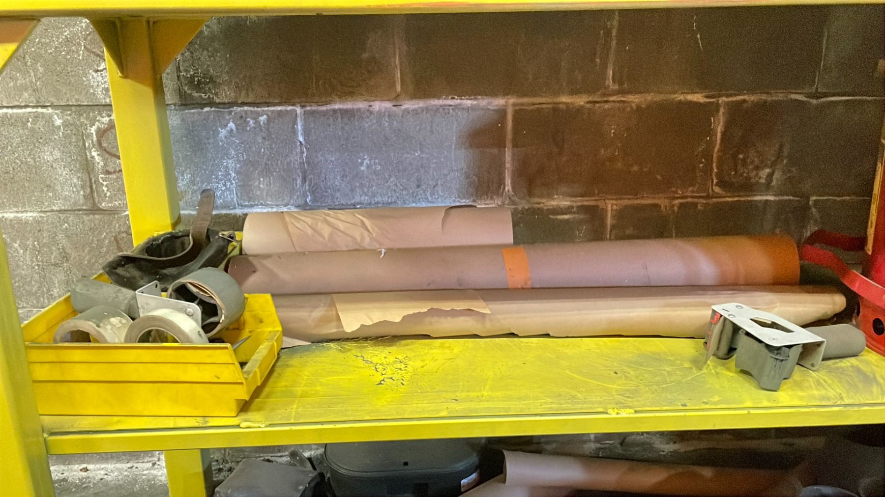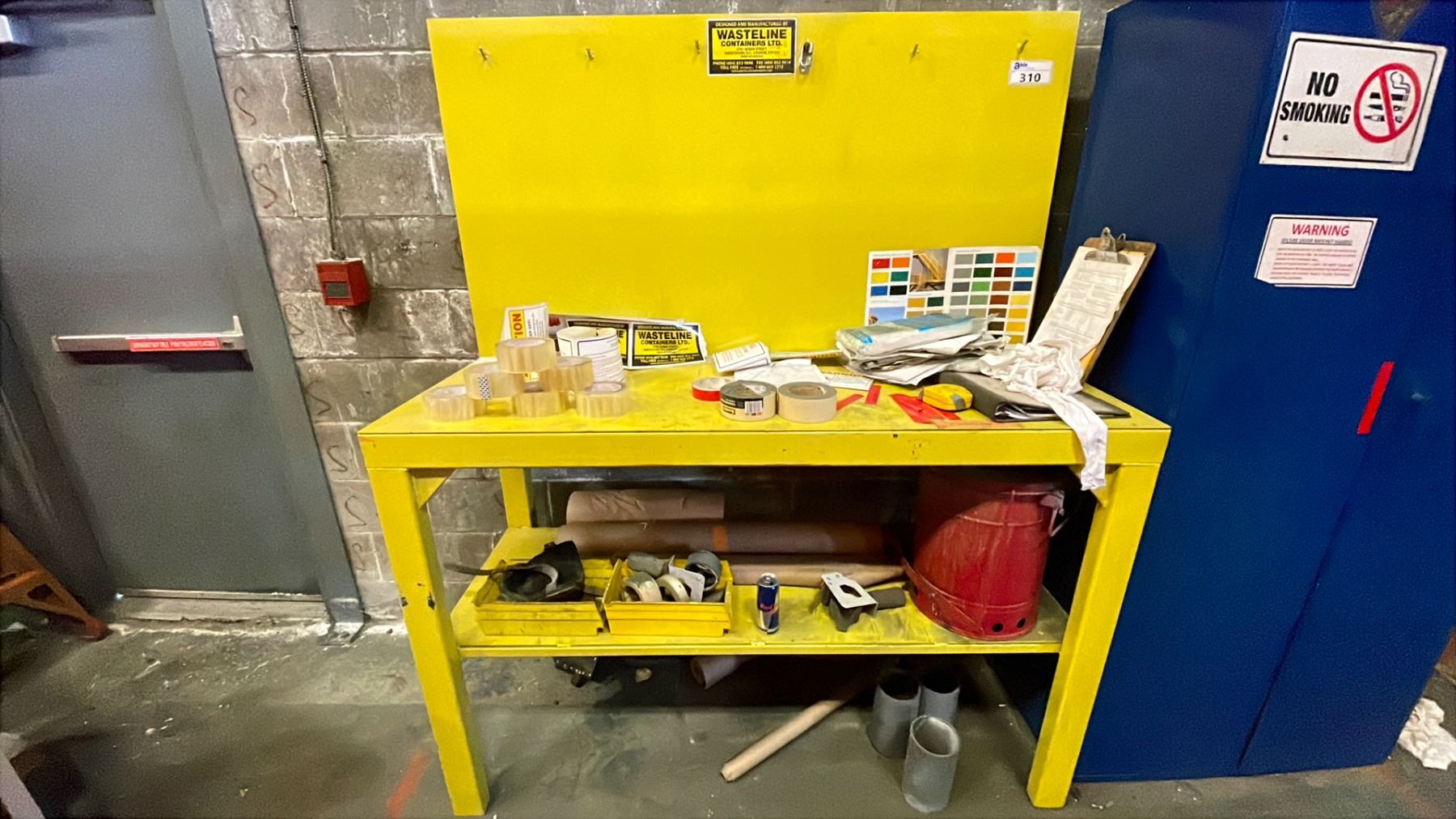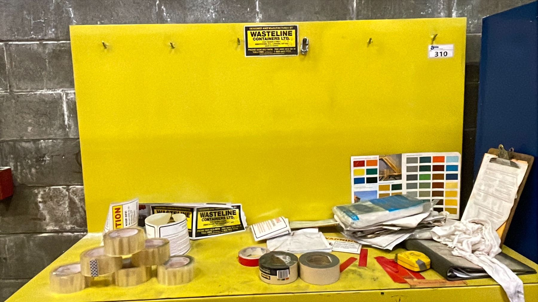 YELLOW WORK TABLE WITH METAL BACK BOARD 72"L X 60"W X 24 "H CONTENTS INCLUDED ROLLS OF TAPE AND MASKING PAPER