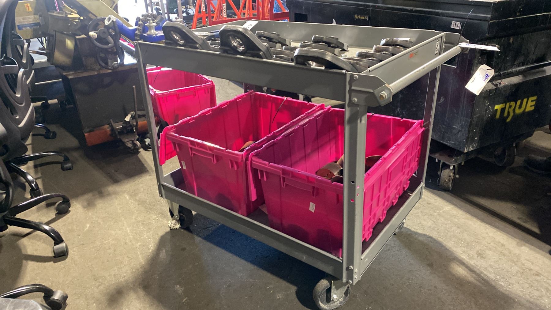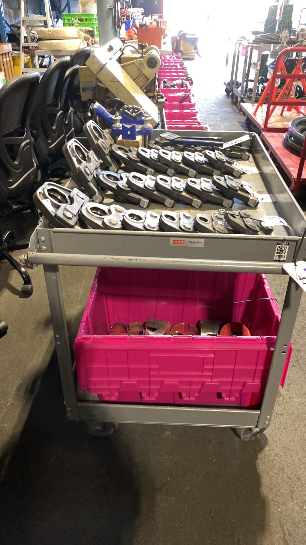 YOST BENCH CHAIN VISE MOUNTED ON ULINE GREY METAL 2 TIER UTILITY CART *CONTENTS ON CART NOT INCLUDED*