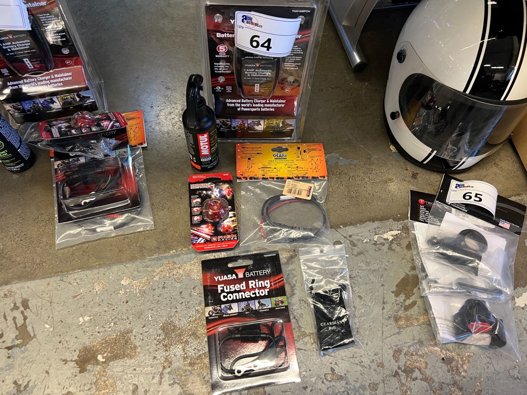 YUASA BATTERY MAINTAINER, YUASA FUSED RING CONNECTOR, GEARS CABLES FOR HEATED CLOTHING, MAGNETIC LIGHT MINE, MOTUL HELMET CLEANER, FLAMES GUARDIAN BELL