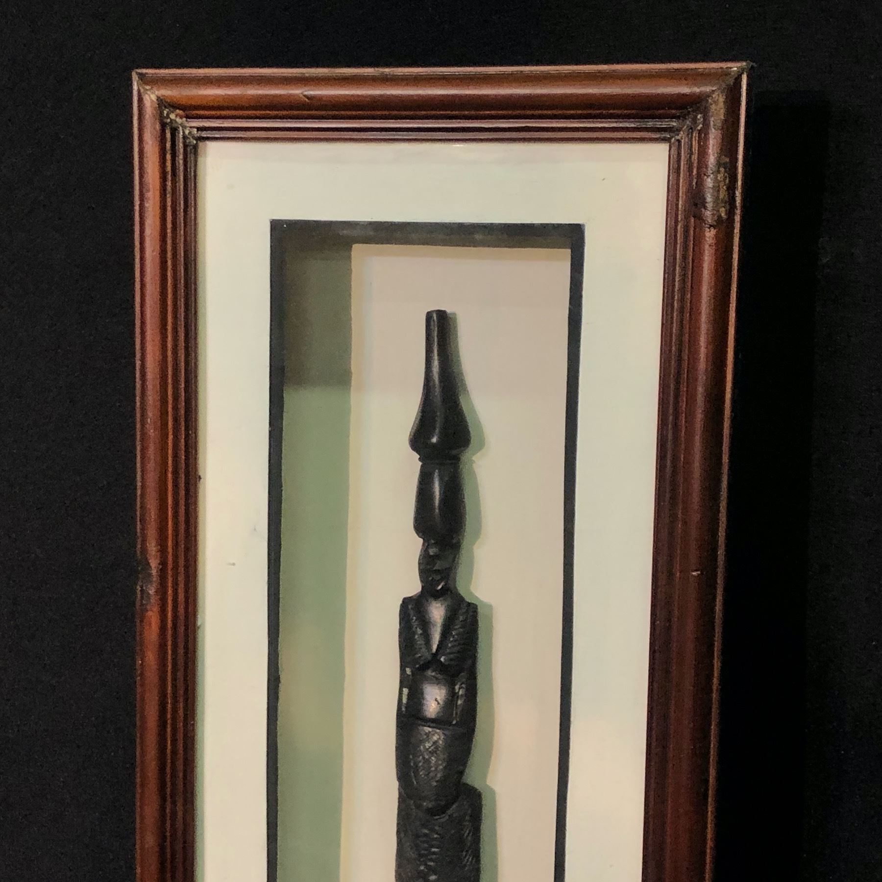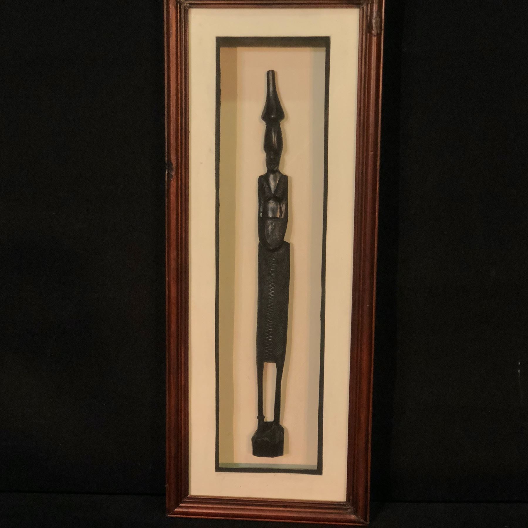 ZIMBABWEAN HAND CARVED TRADITIONAL WOOD STATUE IN FRAME, STATUE APPROX. 15  TALL, NOT INCLUDING