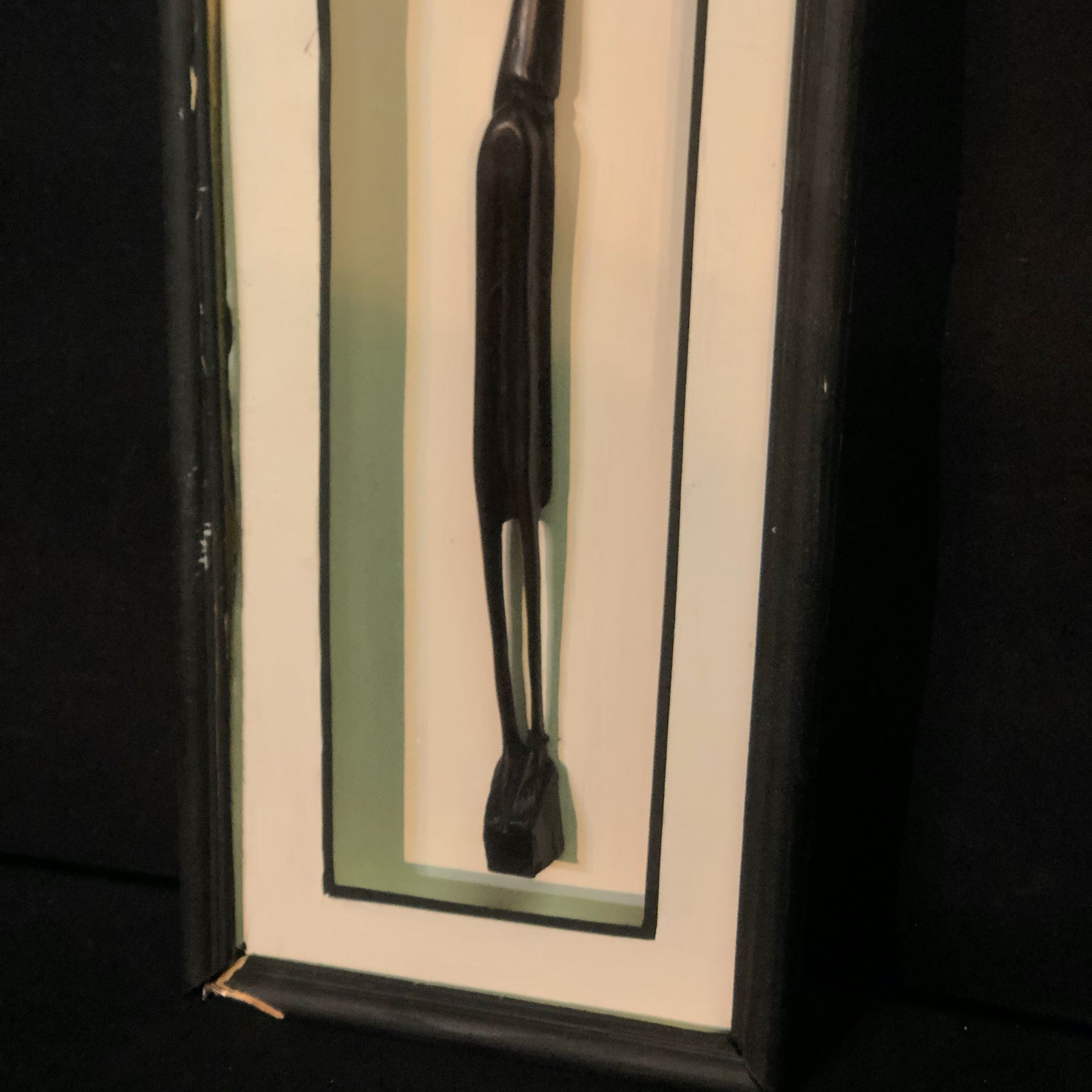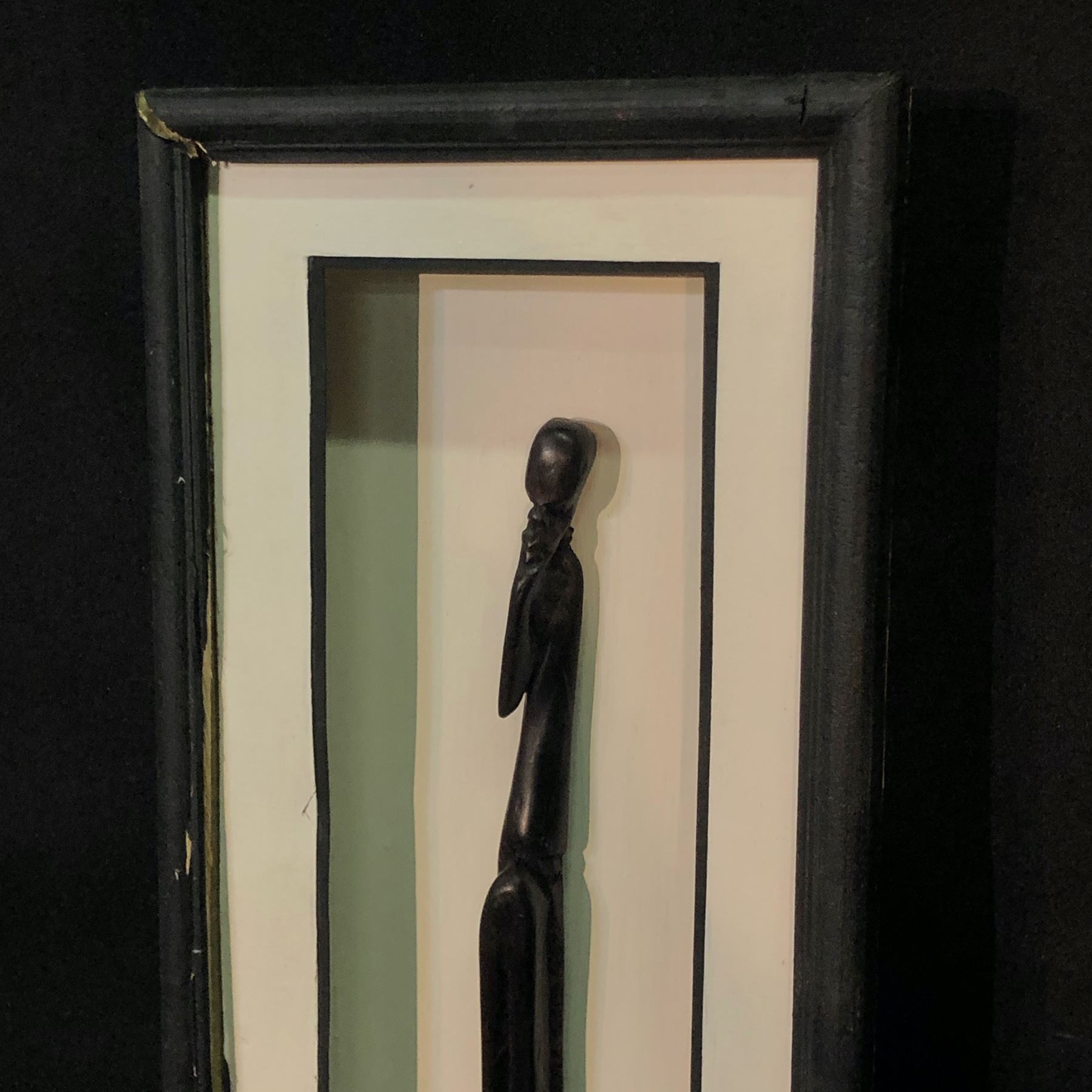 ZIMBABWEAN HAND CARVED TRADITIONAL WOOD STATUE IN FRAME, STATUE APPROX. 15" TALL, NOT INCLUDING FRAME, MISSING GLASS, DAMAGED FRAME
