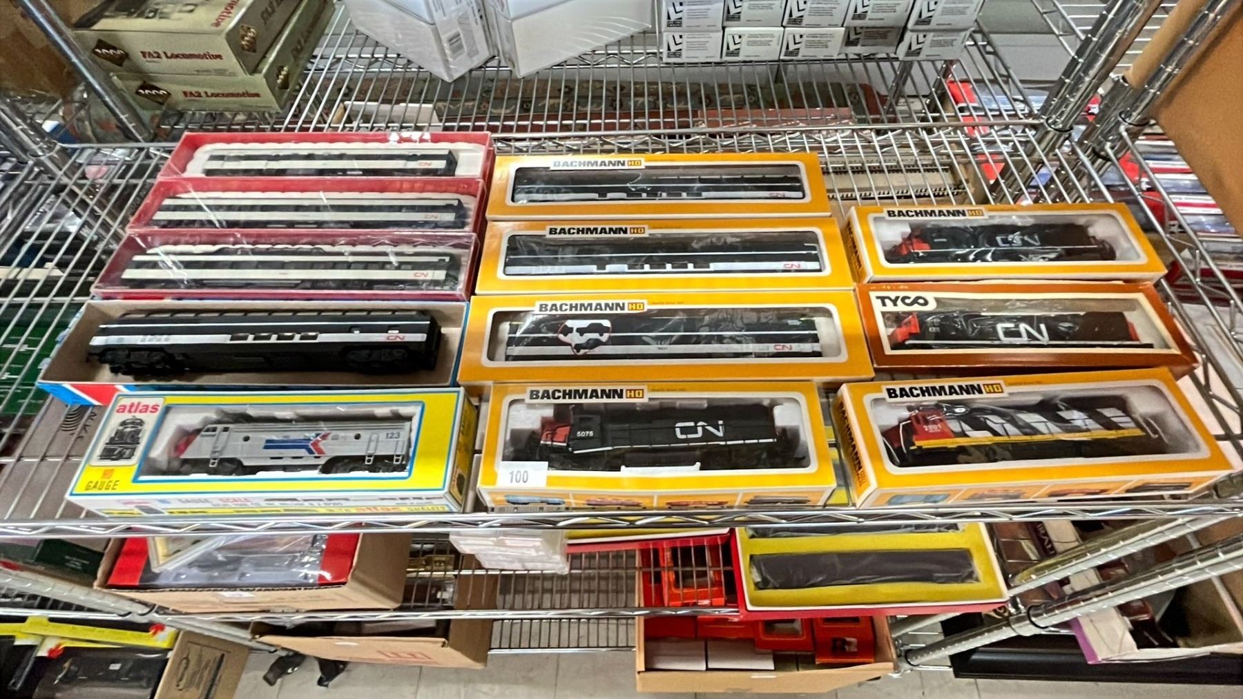 SHELF OF ASSORTED SCALE MODEL TRAINS
